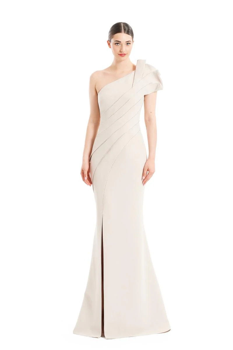 Alexander by Daymor style 1671 is nothing short of timeless. This long one shoulder gown has a pleated wrapped design that finishes into a beautiful slit that is trimmed in shimmering accents. An eye-catching ruffle adds a little something special to the stunning neckline bringing the attention up to your gorgeous face. The long fit and flare silhouette is perfect for any formal occasion such as a mother of the bride gown, or a long formal gown for your next special occasion.