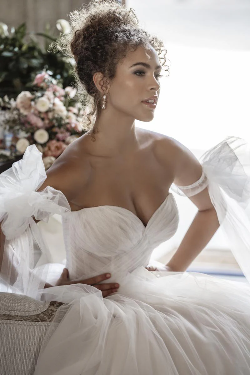 How could you NOT love this gorgeous, princess-inspired tulle ballgown from Allure Bridal's Spring 2023 Wedding Dress collection? As classic as she is modern, style A1100 features beautifully delicate crossover tulle on the bodice of a lovely Basque waist ballgown, just begging to float down the aisle at your destination wedding or beautiful ballroom reception. A flattering strapless, sweetheart neckline completes the look on the illusion bodice. Also available fully lined for a more modest bridal gown look. Consider adding the fun and flirty detachable sleeves for an even more dramatic Say Yes moment (sold separately)! Step aside Cinderella, there's a new princess in town! Please call a Dallas Texas location to check in store availability, pricing, and current ship dates!