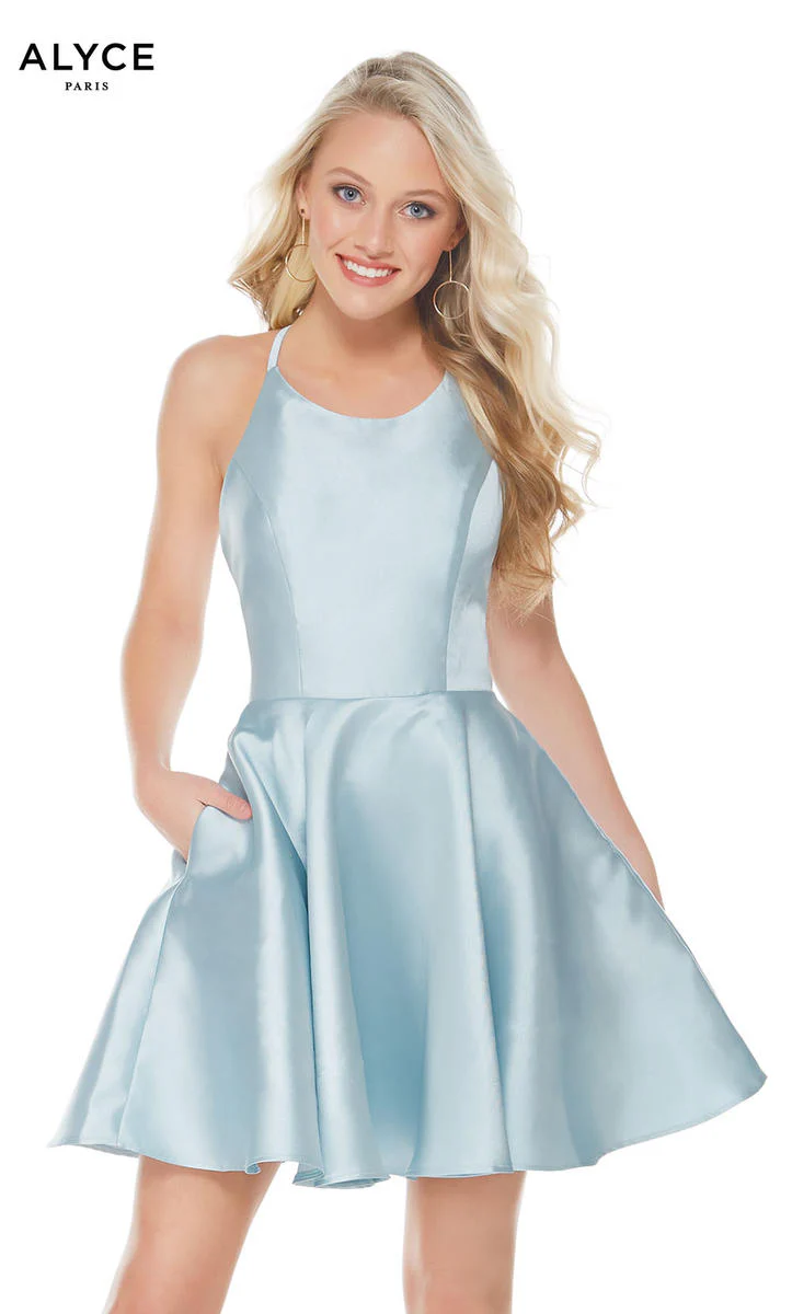Satin Short A-Line Homecoming Dress from the Alyce Paris Collection. Featuring a criss-cross back and A-Line Satin skirt. Wear as a Homecoming Dress, Prom Dress, Formal Dance Dress and more!