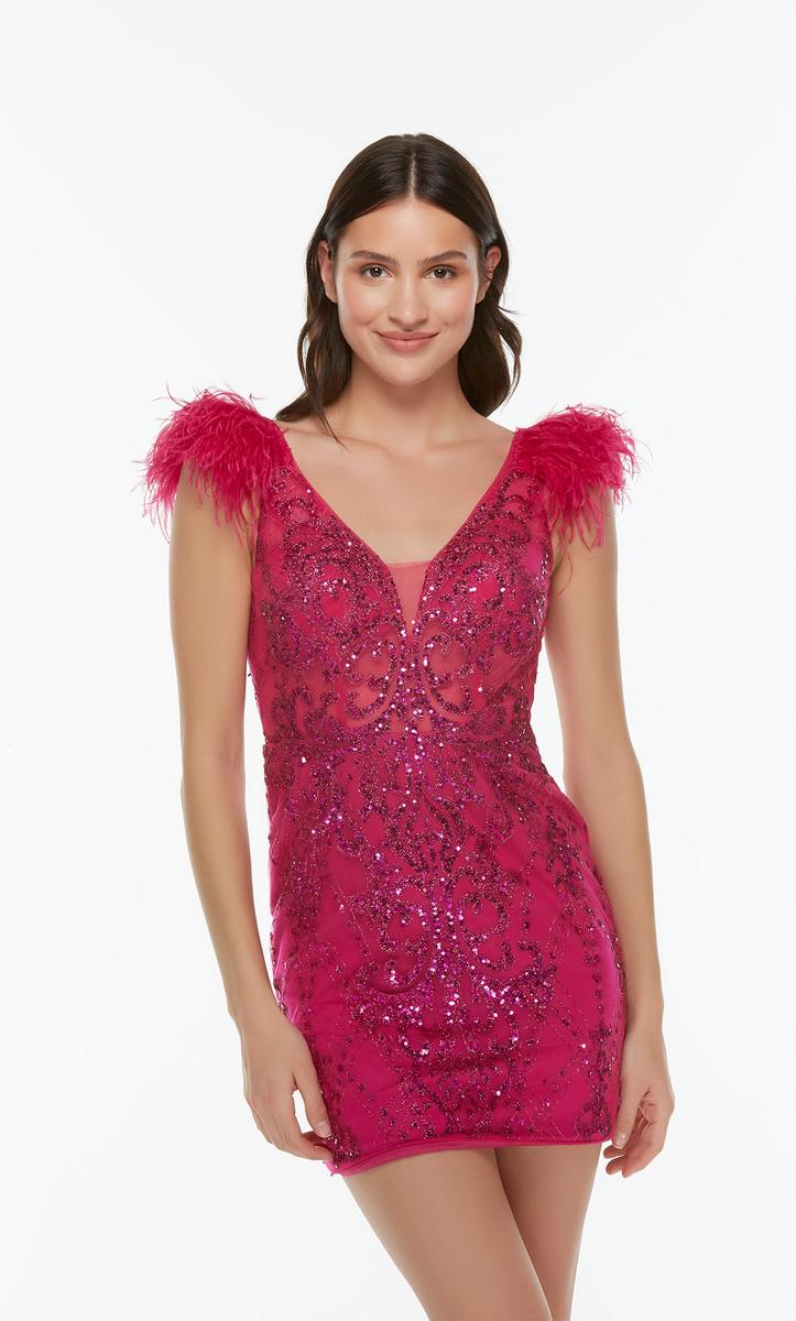 This short, fitted homecoming dress is a confidence booster! 4501, is from Fall 2022 Collection by Alyce Paris that showcases asexy v neck with thick straps that are adorned with fun feather detail. The fitted gown will show off your curves and is adorned with lovely glitter detail. Perfect for any social occasion. Give us a visit in store to try this beauty on and see the endless options.