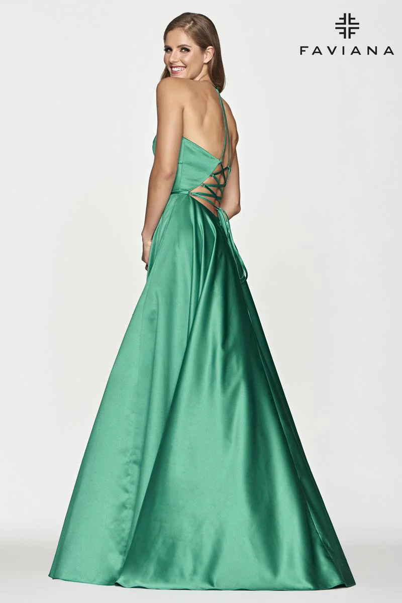 Faviana S10252 is simple, but that doesn't skimp on the style. This gown is a satin a-line dress with a v-back, halter cut neckline, and a low lace-up back. Wear for prom, gala, or any formal event.