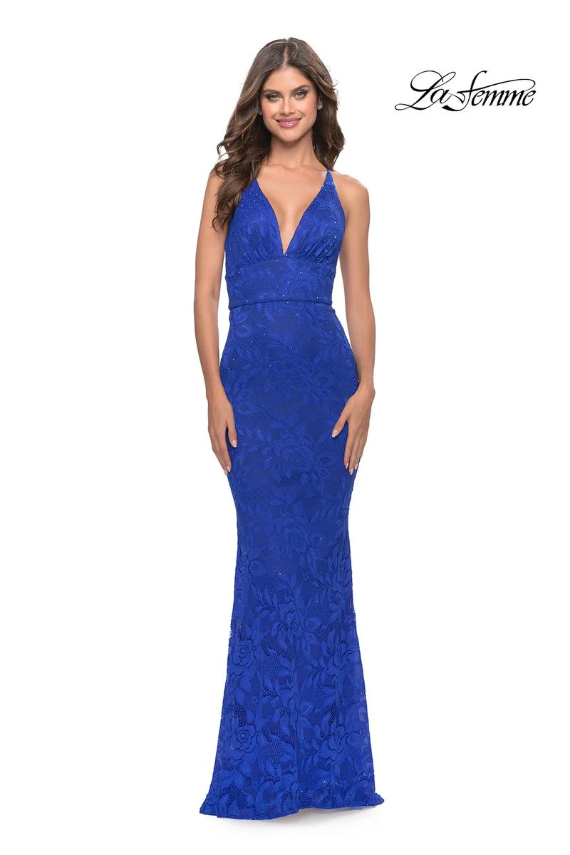 Look and feel like a million bucks in this stunning gown designed by La Femme from Spring 2023 Collection. 31234, is decorated with glamorous hand bead detail, a plunging v neckline, thick straps and an eye-catching open strappy lace-up back. The gown is completed with lace material to flatter the curves. Dont miss out on this gem for Senior Prom, College formal and much more!