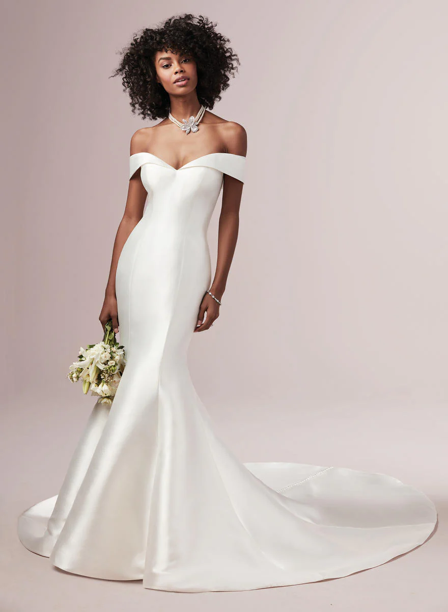 Huron Mikado creates this exquisite fit-and-flare wedding dress featuring a sweetheart neckline with off-the-shoulder sleeves and covered buttons trailing down the train. Finished with covered buttons over zipper closure. Available in plus size. Please call our Dallas, Texas location to check in-store availability, pricing and current ship dates.