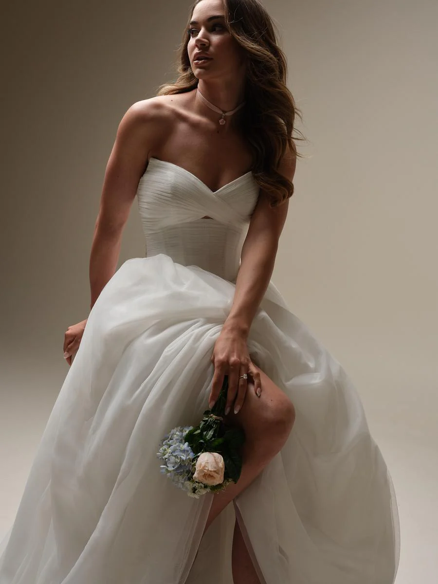 The Maggie Sottero Spring 2025 "Evan" wedding gown is a dreamy, flowy ball gown perfect for brides who adore romance and ethereal style. Made from soft tulle, this gown features a pleated front keyhole detail and a flattering basque waistline that accentuates the figure. A strapless sweetheart neckline pairs beautifully with the plunging illusion tulle back, adding a touch of allure. Detachable self-tie tulle straps provide styling versatility, allowing brides to create a personalized, princess-like look on their special day.