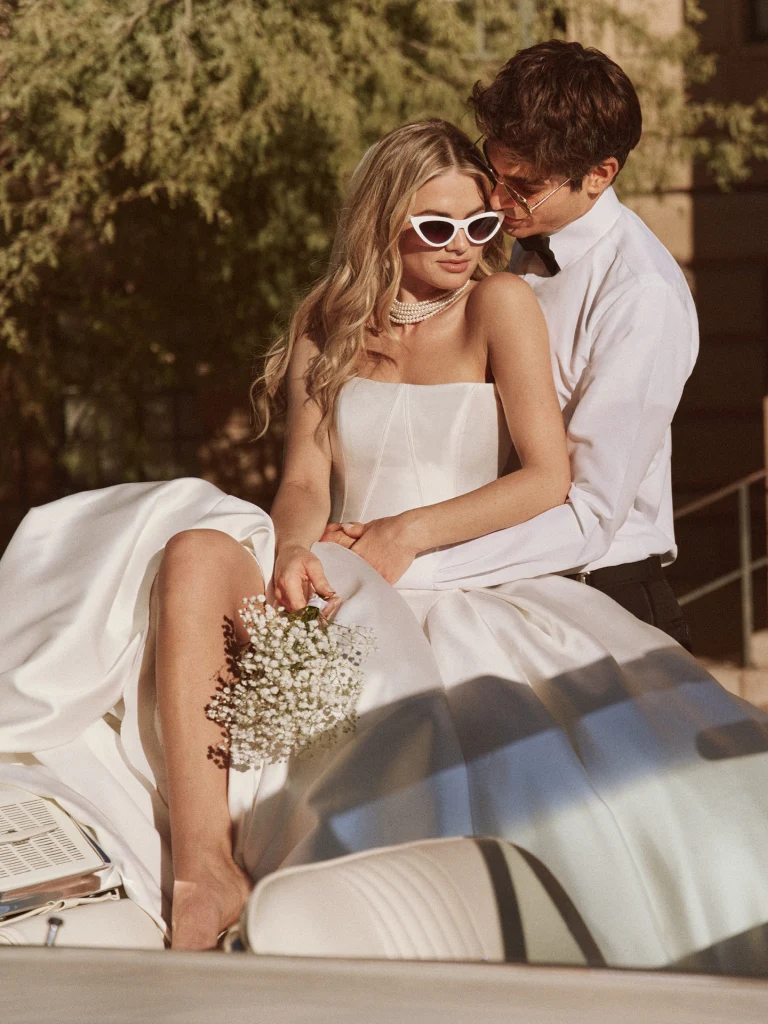 The Fortune gown from the Fall 2024 Maggie Sottero Bridal Collection is a romantic, Bridgerton-inspired masterpiece that has quickly become a staff favorite. This strapless satin gown features a corset detail on the bodice and a dropped waist, creating a flattering silhouette that exudes elegance. The full ballgown skirt adds a touch of drama, perfect for a formal wedding, while the inclusion of pockets brings a chic, modern twist. This gown effortlessly combines classic romance with contemporary style, making it an unforgettable choice for any bride.