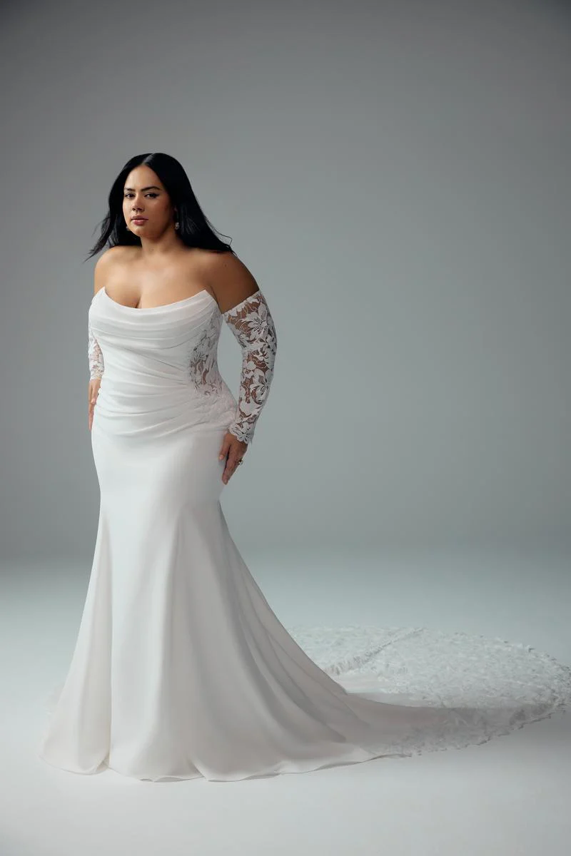 The Lucie wedding gown from Sophia Tollis Spring 2025 collection is a vision of romance and elegance. This enchanting design features a beautifully draped bodice with a flattering scoop neckline and off-shoulder long sleeves, exuding timeless sophistication. Crafted for the modern bride, Lucies ethereal charm is elevated by a dramatic laser-cut train, creating an unforgettable statement as you walk down the aisle. Perfect for those seeking a blend of classic and contemporary style, this gown is as captivating as your love story.