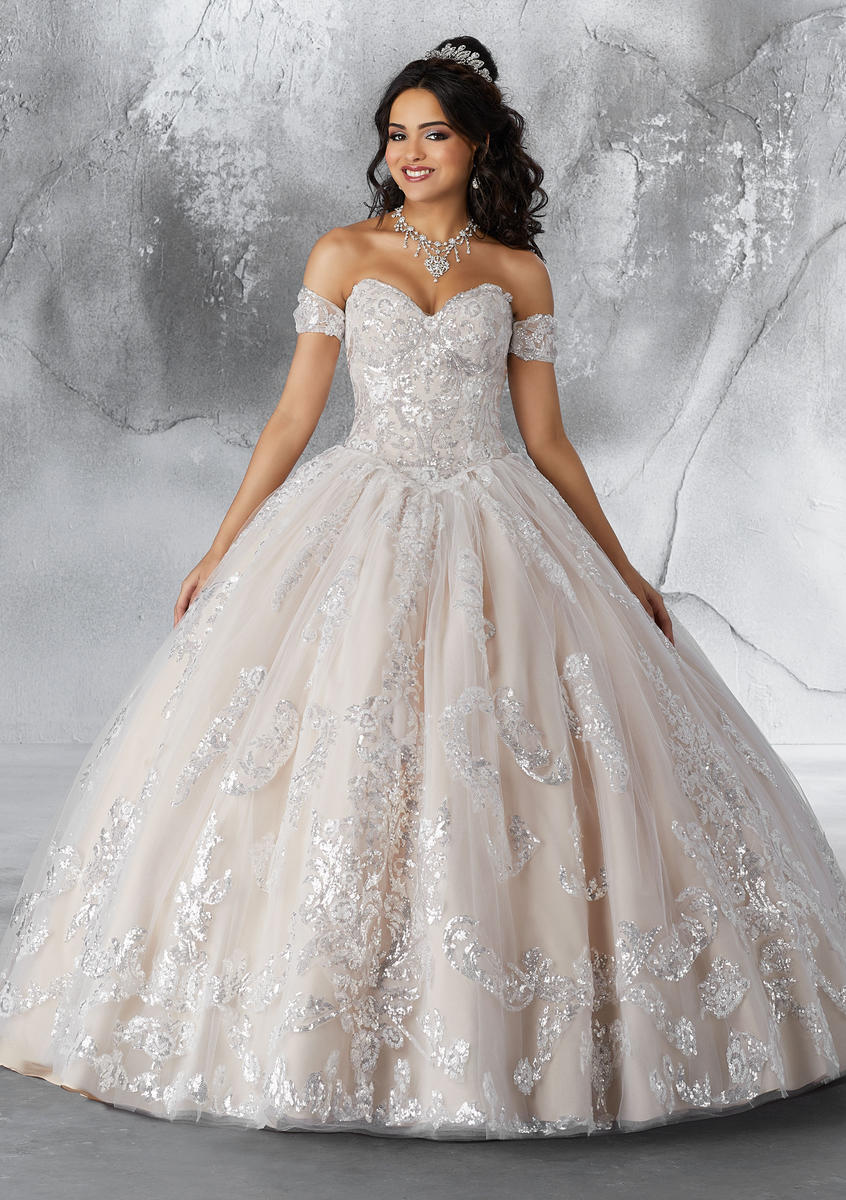 Look stunning in the embroidered sweetheart strapless ball gown. Mori Lee Vizcaya style 89186 is the perfect fit for your Quinceanera, Sweet 16, or any formal event. Throughout the gown is dazzling sequined beading. The stunning back features a form fitting lace-up corset back. Included are detachable lace sleeves and a matching stole